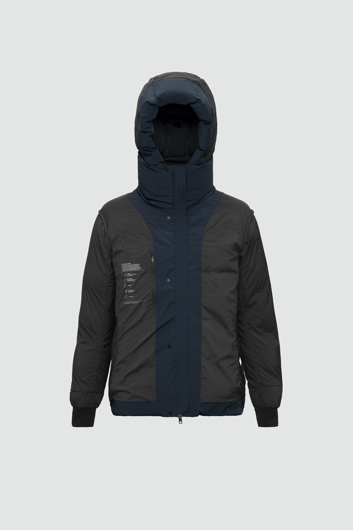 Echo APEX channels a classic short-jacket attitude through modern materials. Upgraded to a 4-way stretch nylon fabric with a stretch lining, it offers unrestricted mobility and a refined wearing sensation. Waterproof, taped-seam construction and Aquaguard zippers deliver full weather protection. Down insulation keeps it light and warm, while a detachable hood, adjustable waist cord, and Lycra cuffs inside the sleeves let you customize fit and seal out drafts.